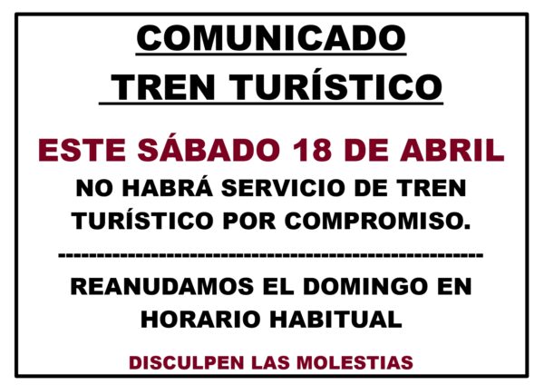 COMUNICADO – SÁBADO 18 DE ABRIL UncategorizedBy Toniabril 15, 2026NO HABRÁ SERVICIO DE TREN TURÍSTICO POR COMPROMISO DISCRECCIONAL
